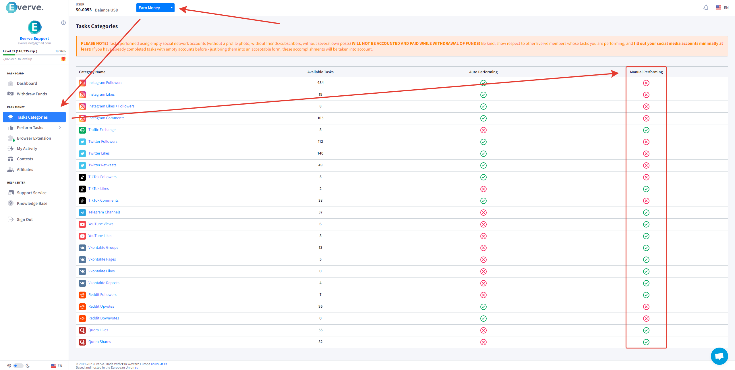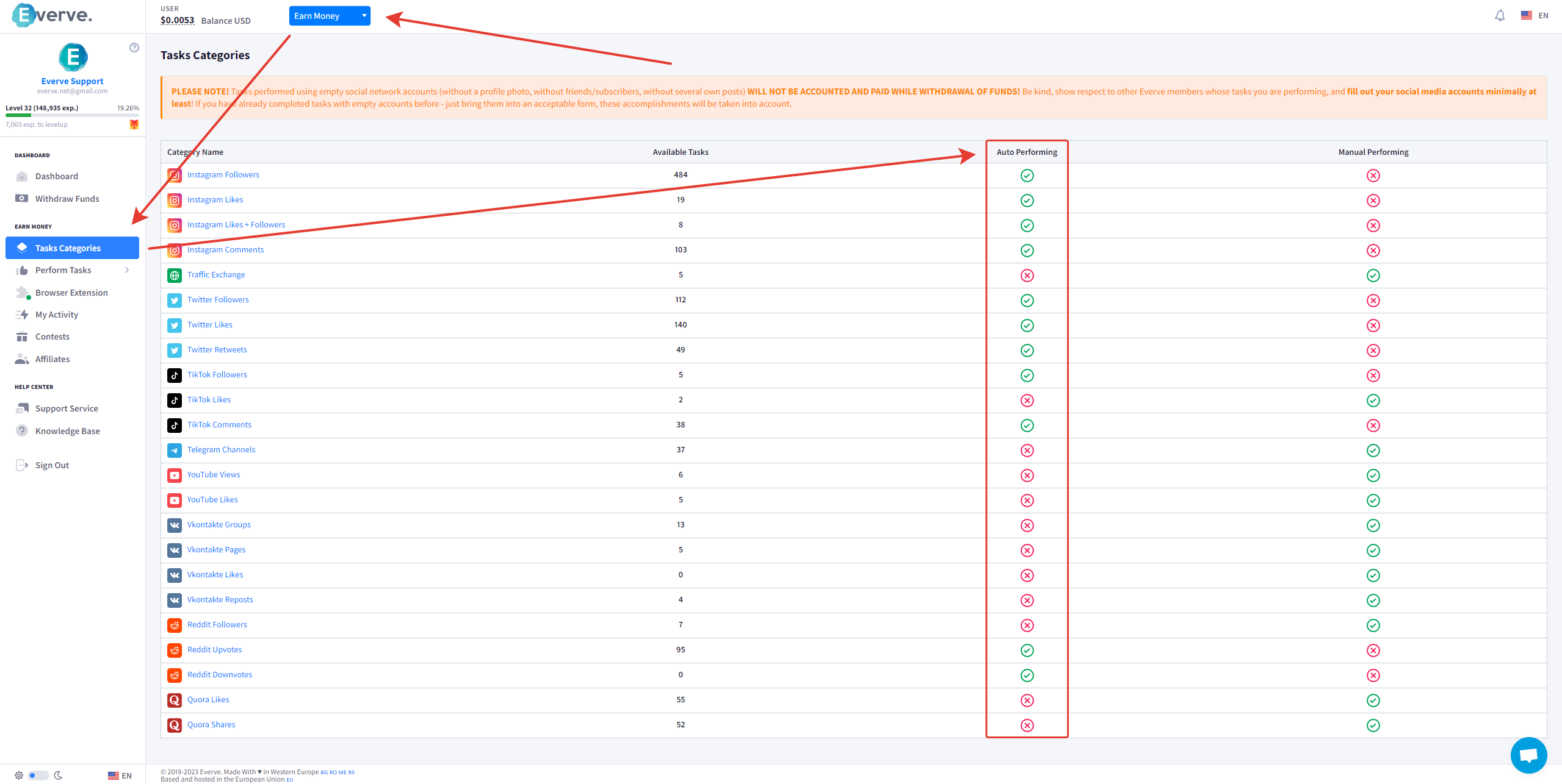 To perform tasks, you must be authorized in the social network where you will perform actions. Please note, in each category there is an instruction for performing - read it carefully!